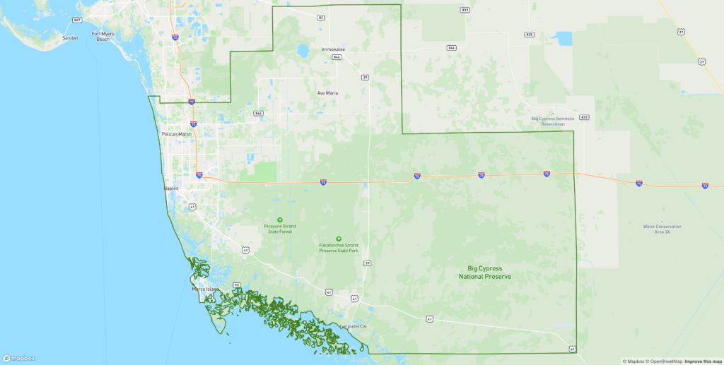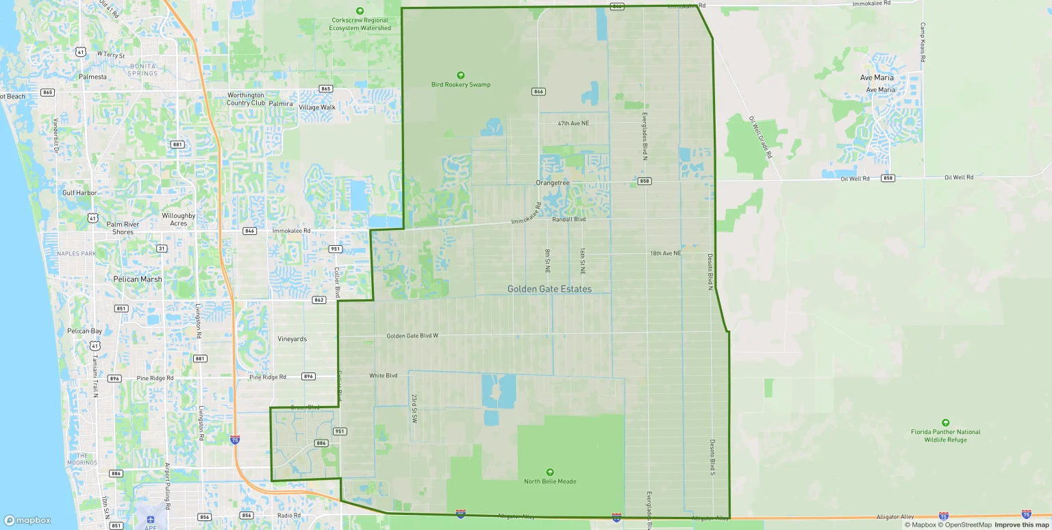 East Naples is very large and extends fairly far east within Collier County. The northeastern edge of this location is an approximate 45 minute drive to downtown Naples. The area has a handful of HOA communities, but is primarily comprised of 1 – 3 acre plus homesites within the non-HOA community of Golden Gate Estates. If proximity to top destinations is less important than having land to do what you want with (within reason), Golden Gate Estates might be a perfect fit.