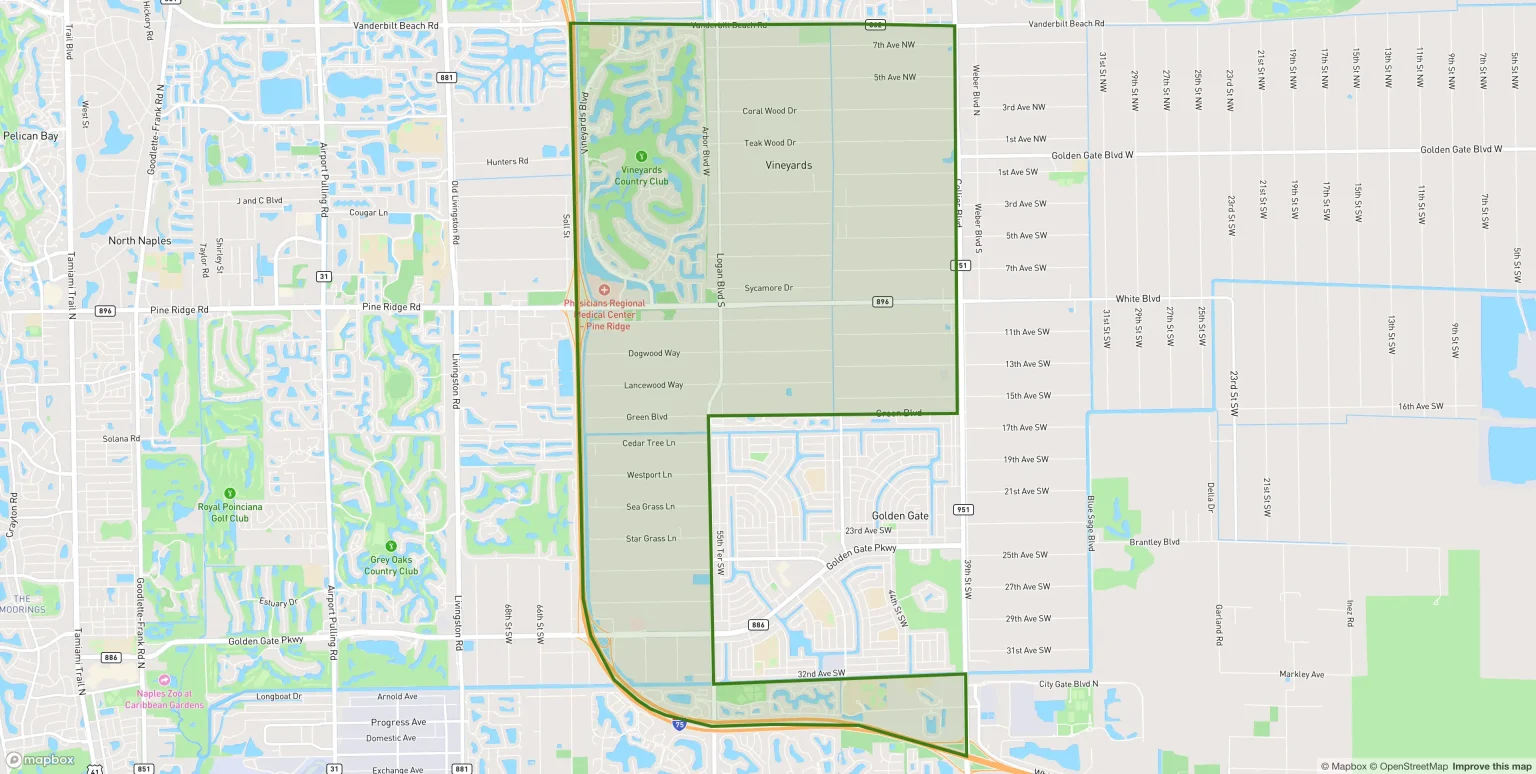 Most of Central Naples East can be divided into two unique sections. Vineyards, a large HOA golf and country club community occupies one section. The other consists of homes on 1 acre + lots within the non-HOA communities of Logan Woods and what some refer to as western portions of Golden Gate Estates. Within the latter are few opportunities for shopping and dining. Furthermore, roadway landscaping upkeep can be lacking.