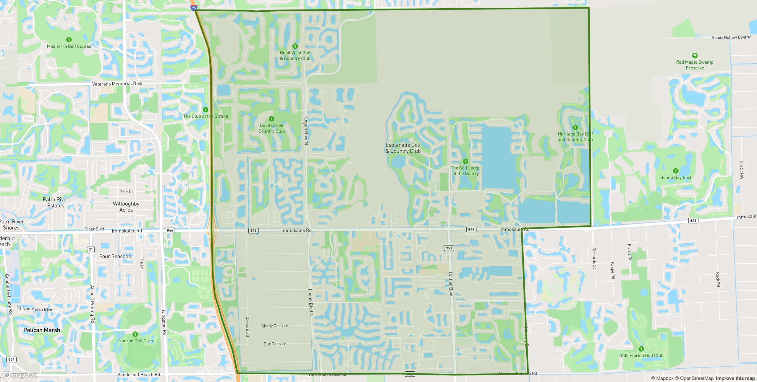 North Naples East is heavily populated by mid-to-large sized gated golf resorts and a handful of HOA communities sans golf. The area has seen a large uptick in commercial development over the past decade or so. New plazas filled with shopping and dining opportunities have been built to meet demand in the immediate area, as well as points further east of it that are seeing major residential development.